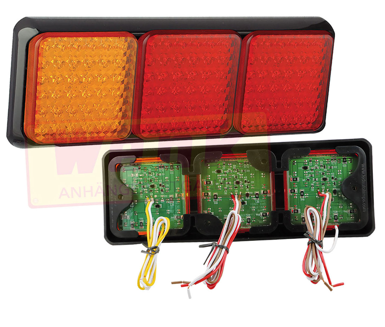 Blink-, Bremsschlussleuchte (rot: Stop, braun: Licht, gelb: Blinker, weiss: Masse) Kabel: 400mm, Lochabstand: 240mm Mass: 278x100x28mm BESTELLUNG NUR AUF KUNDENWUNSCH!